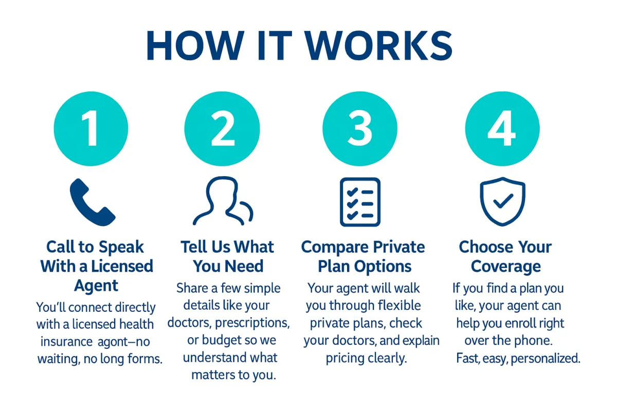 Private health insurance gives you more flexibility, more choices, and more control over your coverage. When you call, a licensed agent will help you compare plan options, check your doctors and prescriptions, and walk you through benefits in simple terms so you can make a confident decision.